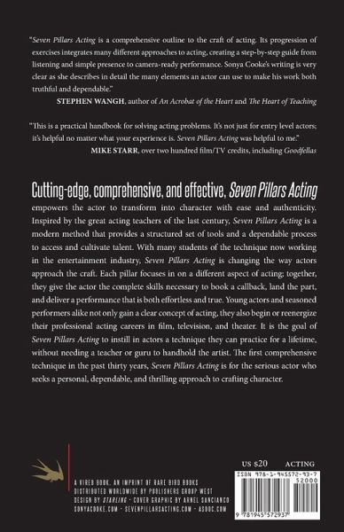 Cutting-edge, comprehensive, and effective, Seven Pillars Acting empowers the actor to transform into character with ease and authenticity. Inspired by the great acting teachers of the last century, Seven Pillars Acting is a modern method that provides a structured set of tools and a dependable process to access and cultivate talent. With many students of the technique now working in the entertainment industry, Seven Pillars Acting is changing the way actors approach the craft. Each pillar focuses in on a different aspect of acting; added together, they give the actor the complete skills necessary to book a callback, land the part, and deliver a performance that is both effortless and true. Young actors and seasoned performers alike not only gain a clear concept of acting, they also begin or reenergize their professional acting careers in film, television, and theater. It is the goal of Seven Pillars Acting to instill in actors a technique that they can practice for a lifetime, without needing a teacher or guru to handhold the artist. The first comprehensive technique in the past thirty years, Seven Pillars Acting is for the serious actor who seeks a personal, dependable, and thrilling approach to crafting character.