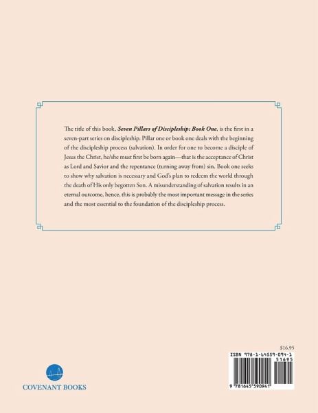 The title of this book, Seven Pillars of Discipleship: Book One, is the first in a seven-part series on discipleship. Pillar one or book one deals with the beginning of the discipleship process (salvation). In order for one to become a disciple of Jesus the Christ, he/she must first be born again-that is the acceptance of Christ as Lord and Savior and the repentance (turning away from) sin. Book one seeks to show why salvation is necessary and God's plan to redeem the world through the death of His only begotten Son. A misunderstanding of salvation results in an eternal outcome, hence, this is probably the most important message in the series and the most essential to the foundation of the discipleship process.