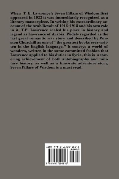 When T. E. Lawrence's Seven Pillars of Wisdom first appeared in 1922 it was immediately recognized as a literary masterpiece. In writing his extraordinary account of the Arab Revolt of 1916-1918 and his own role in it, T.E. Lawrence sealed his place in history and legend as Lawrence of Arabia. Widely regarded as the last great romantic war story and described by Winston Churchill as one of "the greatest books ever written in the English language," it conveys a world of wonders, written in the same committed fashion that Lawrence applied to his duties in Syria, this is a towering achievement of both autobiography and military history, as well as a first-rate adventure story, Seven Pillars of Wisdom is a must read.Wilder Publications is a green publisher. All of our books are printed to order. This reduces waste and helps us keep prices low while greatly reducing our impact on the environment.