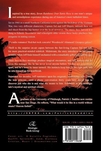 Inspired by a true story, Seven Rainbows Over Santa Rosa is one man's unique and serendipitous experience during one of America's more turbulent times. Set in 1968 in a small Northern California town against the backdrop of the Vietnam War, two very different characters, Captain Sid and Jeff Majors, unleash their wit and shoot-from-the-hip humor over the local airwaves. The music they harvest is a thing to behold. Secretaries and schoolgirls alike swarm these lucky playboys like penguins in mating season. It's radio romance! Red-hot rock concerts! Woodstock! Altamont! Groupies galore! Thrill to the surprise on-air capers between the fast-living Captain Sid and Jeff, his more practical-minded sidekick. Midstream, the story introduces an intriguing wrinkle, when Jeff finds himself enchanted with a remarkably gifted girl half his age. Their face-to-face meetings produce magical encounters, and Jeff realizes that he loves this teenager like he has never loved anyone before. Yet they are generations apart, and he's beset by inner turmoil. His instincts keep him on the right path, and he sets himself up for heartbreak. Separated for decades, Jeff ruminates upon his enigmatic relationship with Cindy, the teen princess...until a phone conversation thirty years later drives him to discover just who she is and what she means to him. Exhilarate in this nostalgic tale's mystical and spiritual climax. A graduate of the University of Pittsburgh, Patrick J. Saddles now resides near San Diego. He reflects, "What would it be like in a world without music? Heaven forbid!" http://SBPRA.com/PatrickJSaddles