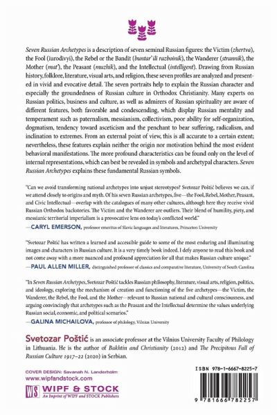 Seven Russian Archetypes is a description of seven seminal Russian figures: the Victim (zhertva), the Fool (iurodivyi), the Rebel or the Bandit (buntar' ili razboinik), the Wanderer (strannik), the Mother (mat'), the Peasant (muzhik), and the Intellectual (intelligent). Drawing from Russian history, folklore, literature, visual arts, and religion, these seven profiles are analyzed and presented in vivid and evocative detail. The seven portraits help to explain the Russian character and especially the groundedness of Russian culture in Orthodox Christianity. Many experts on Russian politics, business and culture, as well as admirers of Russian spirituality are aware of different features, both favorable and condescending, which display Russian mentality and temperament such as paternalism, messianism, collectivism, poor ability for self-organization, dogmatism, tendency toward asceticism and the penchant to bear suffering, radicalism, and inclination to extremes. From an external point of view, this is all accurate to a certain extent; nevertheless, these features explain neither the origin nor motivation behind the most evident behavioral manifestations. The more profound characteristics can be found only on the level of internal representations, which can best be revealed in symbols and archetypal characters. Seven Russian Archetypes explains these fundamental Russian symbols.
