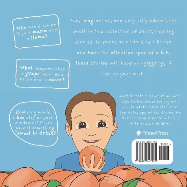 Who would you be if your mama was a llama? What happens when a grape becomes a raisin and is eaten? How long would a bee stay on your windowsill if you gave it something sweet to drink? Fun, imaginative, and very silly adventures await in this collection of short, rhyming stories. If you're as curious as a kitten and have the attention span of a fish, these stories will have you giggling, if that is your wish.