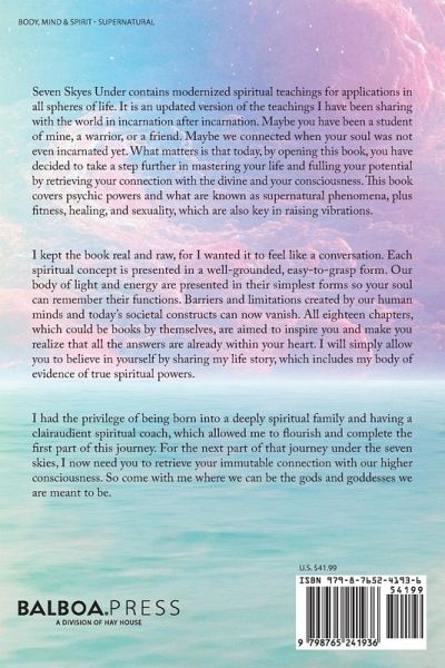 Seven Skyes Under contains modernized spiritual teachings for applications in all spheres of life. It is an updated version of the teachings I have been sharing with the world in incarnation after incarnation. Maybe you have been a student of mine, a warrior, or a friend. Maybe we connected when your soul was not even incarnated yet. What matters is that today, by opening this book, you have decided to take a step further in mastering your life and fulling your potential by retrieving your connection with the divine and your consciousness. This book covers psychic powers and what are known as supernatural phenomena, plus fitness, healing, and sexuality, which are also key in raising vibrations. I kept the book real and raw, for I wanted it to feel like a conversation. Each spiritual concept is presented in a well-grounded, easy-to-grasp form. Our body of light and energy are presented in their simplest forms so your soul can remember their functions. Barriers and limitations created by our human minds and today's societal constructs can now vanish. All eighteen chapters, which could be books by themselves, are aimed to inspire you and make you realize that all the answers are already within your heart. I will simply allow you to believe in yourself by sharing my life story, which includes my body of evidence of true spiritual powers. I had the privilege of being born into a deeply spiritual family and having a clairaudient spiritual coach, which allowed me to flourish and complete the first part of this journey. For the next part of that journey under the seven skies, I now need you to retrieve your immutable connection with our higher consciousness. So come with me where we can be the gods and goddesses we are meant to be.