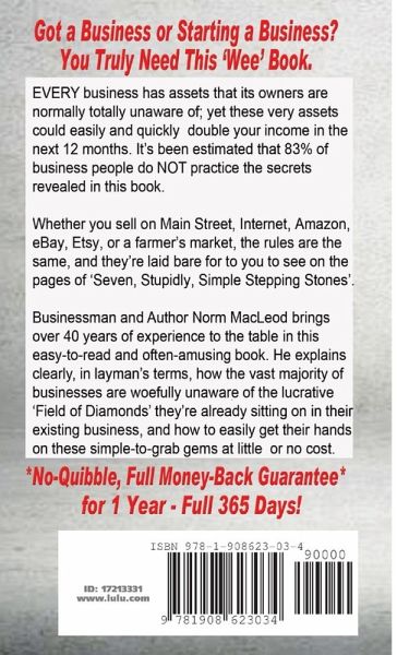 ***$47 Free Gift Included*** This often-hilarious book has a serious edge. Author and businessman of 40 years, Norm MacLeod, explains in easy-to-read, layman's terms, how to boost your business massively in 12 months, whether new or existing, and whether online or on Main Street. Unusually, the author 'puts his money where his mouth is' by including a unique, 365 Day, Money Back Guarantee if your business does NOT increase by at least 20%% in 12 months. Fun and informative, and in a convenient pocket-sized format to fit in a coat pocket or in your purse. Recommended!