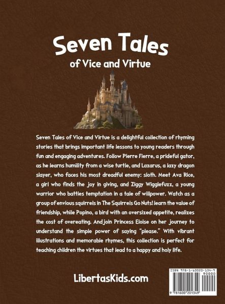 Embark on a journey of fun, rhyme, and timeless lessons! In Seven Tales of Vice and Virtue, young readers will delight in the adventures of charming characters as they navigate life's challenges through whimsical, rhyming tales that make learning unforgettable. Each story pairs a classic vice with its opposing virtue, helping children understand important life lessons while having a blast along the way. Meet Pierre Fierre, a prideful gator who's never lost a dare-until a humble turtle teaches him that winning isn't everything. Lazarus, a young dragon slayer, must overcome a foe fiercer than any dragon in the land: sloth. Ava Rice can't get enough, but when she discovers the joy of giving, she realizes that some treasures are beyond price. Ziggy Wigglefuzz, a young warrior, must resist the allure of the tantalizing Glimmer Gum in a tale of willpower. In The Squirrels Go Nuts!, a group of envious rodents finds out the hard way that comparing acorns can crack even the strongest friendships. Popino, a bird with an oversized appetite, learns that overeating isn't worth the price of being grounded. Finally, join Princess Eloise as she discovers the power of a simple word-please-in an adventurous tale about the grace of meekness. These seven rhyming stories, brought to life with beautiful illustrations, are perfect for teaching children about the virtues that lead to a happy, fulfilling life. Whether you're sharing these tales at bedtime or enjoying them in the classroom, Seven Tales of Vice and Virtue is a collection that will bring smiles and wisdom to readers young and old. LibertasKids.com