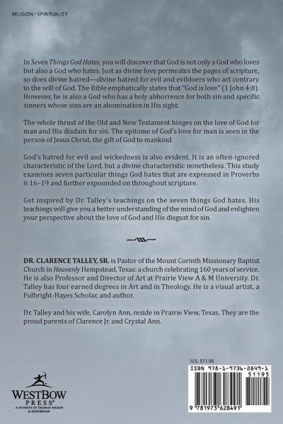 In Seven Things God Hates, you will discover that God is not only a God who loves but also a God who hates. Just as divine love permeates the pages of scripture, so does divine hatreddivine hatred for evil and evildoers who act contrary to the will of God. The Bible emphatically states that God is love (1 John 4:8). However, he is also a God who has a holy abhorrence for both sin and specific sinners whose sins are an abomination in His sight. The whole thrust of the Old and New Testament hinges on the love of God for man and His disdain for sin. The epitome of Gods love for man is seen in the person of Jesus Christ, the gift of God to mankind. Gods hatred for evil and wickedness is also evident. It is an often-ignored characteristic of the Lord, but a divine characteristic nonetheless. This study examines seven particular things God hates that are expressed in Proverbs 6:1619 and further expounded on throughout scripture. Get inspired by Dr. Talleys teachings on the seven things God hates. His teachings will give you a better understanding of the mind of God and enlighten your perspective about the love of God and His disgust for sin.