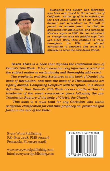 Prophecy has always been a very interesting subject, for it is the study of what is going to happen. Man wants to know tomorrow before tomorrow comes. The Bible has been absolutely accurate for the past prophecies and no doubt will be accurate for the future prophecies. It is man that doesn't get things right. It seems like there is a new view that comes out almost every year on the end times. People are claiming to have had visions of what is going to happen. Such will be happening right up to the end. Seven Years covers the layout of Daniel's 70th week, which is also known as the Tribulation period. Some have claimed the first half of the 70th week took place during the earthly ministry of Jesus Christ. This book shows clearly why that is not right. When the reader gets through reading Seven Years they will understand the Tribulation layout, when the Mark of the Beast is applied, the Second Coming of Jesus Christ and lastly, the anointing of the most Holy.