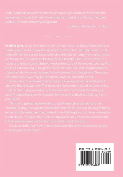 As little girls, we all have dreams of how our lives should go. From visions of meeting prince charming, being swept off of our feet, getting married, and riding off into the sunset to experiencing the bliss of happily ever after, these are the makings of what we believe to be a beautiful life. Far too often, our hopes and dreams are shattered. And as the story of life unfolds, we may find ourselves attempting to navigate a maze of tears, lies, and disappointments of people who we once believed to be instruments of happiness. There are even times when we may fall asleep in a mystical romantic coma, unconscious and unaware of what is right or wrong, amidst a whirlwind of what we thought was love. This maze of entanglement could be your reality, until the day that you awaken and become attuned to love that even you weren't expecting. Love in its purest form was your destiny all along, if only you believe. Through captivating storytelling, Leah Pump takes you along for an intimate journey. Her quest to leave the table when love was no longer being served and to rediscover the greatest love of all inspires us to bear witness to the mistakes, missteps, men, and the myriad of circumstances experienced that ultimately prepared her for the abundance of blessings. Discover truth that moves you to tears and ignites your applause as you enter the pages of "Seven".