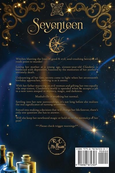 Witches blurring the lines of good & evil, soul-crushing betrayal, all roads point to murder! Losing her mother at a young age, sixteen-year-old Claudette is burdened with depression, haunted by the memories of her mother's untimely death. Unknowing of her fate, secrets come to light when her seventeenth birthday approaches, nothing is as it seems. With her father marrying an evil woman, gifting her two equally vile step sisters, Claudette's world is upended when he accepts a job in a new town steeped in mystery, magic, and darkness. Mashalville is anything but normal. Settling into her new surroundings it's not long before she realizes the real significance of turning seventeen. Forced into making a decision that will change her life forever, there's only one question she has to answer. Will she keep her newfound magic or hold on to the normalcy of her past? ** Please check trigger warnings**