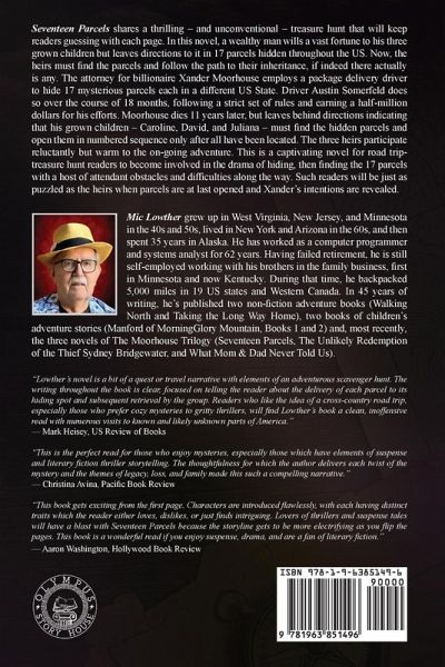 Seventeen Parcels shares a thrilling - and unconventional - treasure hunt that will keep readers guessing with each page. In this novel, a wealthy man wills a vast fortune to his three grown children but leaves directions to it in 17 parcels hidden throughout the US. Now, the heirs must find the parcels and follow the path to their inheritance, if indeed there actually is any. The attorney for billionaire Xander Moorhouse employs a package delivery driver to hide 17 mysterious parcels each in a different US State. Driver Austin Somerfeld does so over the course of 18 months, following a strict set of rules and earning a half-million dollars for his efforts. Moorhouse dies 11 years later, but leaves behind directions indicating that his grown children - Caroline, David, and Juliana - must find the hidden parcels and open them in numbered sequence only after all have been located. The three heirs participate reluctantly but warm to the on-going adventure. This is a captivating novel for road trip treasure hunt readers to become involved in the drama of hiding, then finding the 17 parcels with a host of attendant obstacles and difficulties along the way. Such readers will be just as puzzled as the heirs when parcels are at last opened and Xander's intentions are revealed.