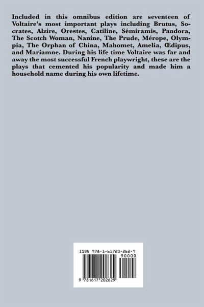 Included in this omnibus edition are seventeen of Voltaire's most important plays including Brutus, Socrates, Alzire, Orestes, Catiline, Sémiramis, Pandora, The Scotch Woman, Nanine, The Prude, Mérope, Olympia, The Orphan of China, Mahomet, Amelia, ¿dipus, and Mariamne. During his life time Voltaire was far and away the most successful French playwright, these are the plays that cemented his popularity and made him a household name during his own lifetime. Wilder Publications is a green publisher. All of our books are printed to order. This reduces waste and helps us keep prices low while greatly reducing our impact on the environment.