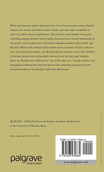 Advice books published by women were a popular genre in Seventeenth and early Eighteenth-century England and they were moral manuals with strong religious overtones. Here, Urban highlights a notable exception: Age Rectified, which counsels women to acquire a 'disposition of mind' in old age which allows them to be accepted by younger generations.