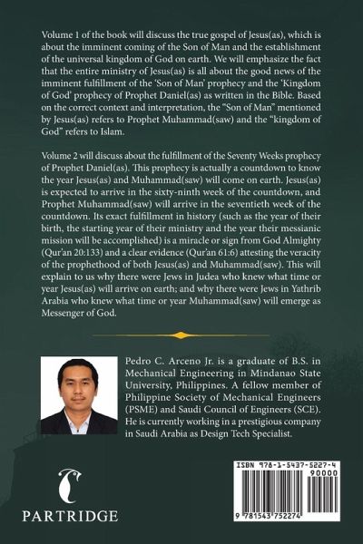 Volume 1 of the book will discuss the true gospel of Jesus(as), which is about the imminent coming of the Son of Man and the establishment of the universal kingdom of God on earth. We will emphasize the fact that the entire ministry of Jesus(as) is all about the good news of the imminent fulfillment of the 'Son of Man' prophecy and the 'Kingdom of God' prophecy of Prophet Daniel(as) as written in the Bible. Based on the correct context and interpretation, the "Son of Man" mentioned by Jesus(as) refers to Prophet Muhammad(saw) and the "kingdom of God" refers to Islam. Volume 2 will discuss about the fulfillment of the Seventy Weeks prophecy of Prophet Daniel(as). This prophecy is actually a countdown to know the year Jesus(as) and Muhammad(saw) will come on earth. Jesus(as) is expected to arrive in the sixty-ninth week of the countdown, and Prophet Muhammad(saw) will arrive in the seventieth week of the countdown. Its exact fulfillment in history (such as the year of their birth, the starting year of their ministry and the year their messianic mission will be accomplished) is a miracle or sign from God Almighty (Qur'an 20:133) and a clear evidence (Qur'an 61:6) attesting the veracity of the prophethood of both Jesus(as) and Muhammad(saw). This will explain to us why there were Jews in Judea who knew what time or year Jesus(as) will arrive on earth; and why there were Jews in Yathrib Arabia who knew what time or year Muhammad(saw) will emerge as Messenger of God.