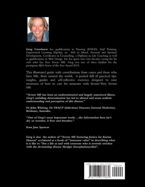 This illustrated guide with contributions from carers and those who are ill, from around the world, is packed full of practical tips, insights, guides and self-reflective exercises designed to raise awareness of how to care for someone with Severe/Very Severe M.E. Greg Crowhurst PgDip, Cert Counselling, Dip Life Coaching, MA, who qualified as a Registered Nurse in 1984, has spent over two decades caring for his wife who has Very Severe ME. In 2015 he was a finalist in the prestigious BJN Nurse of the Year Award, receiving a certificate in Clinical Excellence in Nursing. Greg is the author of "Severe ME featuring Justice for Karina Hansen" widely acclaimed as a book of "immense value" in describing what it is like to "live a life as and with someone who is severely stricken with the devastating disease Myalgic Encephalomyelitis".
