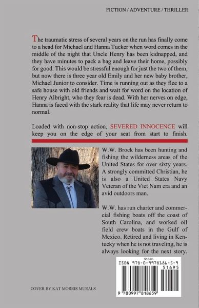 The traumatic stress of several years on the run has finally come to a head for Michael and Hanna Tucker when word comes in the middle of the night that Uncle Henry has been kidnapped, and they have minutes to pack a bag and leave their home, possibly for good. This would be stressful enough for just the two of them, but now there is three year old Emily and her new baby brother, Michael Junior to consider. Time is running out as they flee to a safe house with old friends and wait for word on the location of Henry Albright, who they fear is dead. With her nerves on edge, Hanna is faced with the stark reality that life may never return to normal. Loaded with non-stop action, SEVERED INNOCENCE will keep you on the edge of your seat from start to finish.