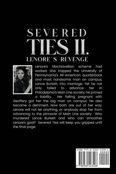 Lenore's Machiavellian scheme had worked. She trapped the University of Pennsylvania's All-American quarterback and most handsome man on campus, Lance Burket, into marriage. Yet he had not only failed to advance her in Philadelphia's Main Line society, he proved a liability. Her falling pregnant with Geoffery got her the big man on campus. He also became a detriment. Now both are out of her way. Lenore will not let anything or anybody stop her from advancing to the pinnacle of Main Line society. Who murdered Lance Burkett and who can smoother Lenore's goal? Severed Ties II will keep you gripped until the final page.