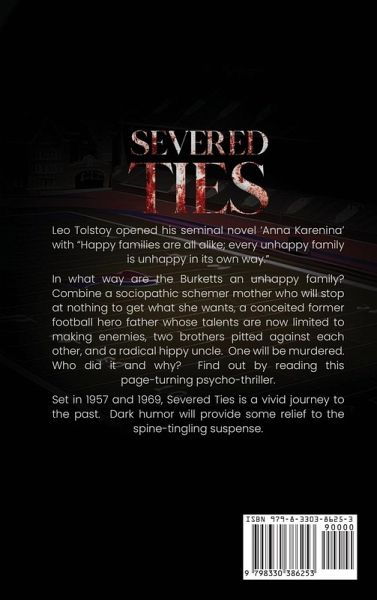 Leo Tolstoy opened his seminal novel 'Anna Karenina' with "Happy families are all alike; every unhappy family is unhappy in its own way." In what way are the Burketts an unhappy family? Combine a sociopathic schemer mother who will stop at nothing to get what she wants, a conceited former football hero father whose talents are now limited to making enemies, two brothers pitted against each other, and a radical hippy uncle. One will be murdered. Who did it and why? Find out by reading this page-turning psycho-thriller. Set in 1957 and 1969, Severed Ties is a vivid journey to the past. Dark humor will provide some relief to the spine-tingling suspense.