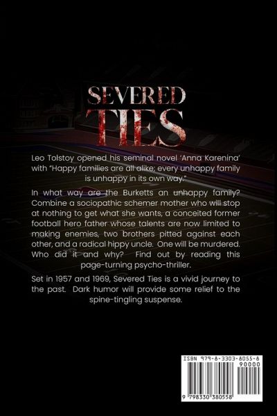 Leo Tolstoy opened his seminal novel 'Anna Karenina' with "Happy families are all alike; every unhappy family is unhappy in its own way." In what way are the Burketts an unhappy family? Combine a sociopathic schemer mother who will stop at nothing to get what she wants, a conceited former football hero father whose talents are now limited to making enemies, two brothers pitted against each other, and a radical hippy uncle. One will be murdered. Who did it and why? Find out by reading this page-turning psycho-thriller. Set in 1957 and 1969, Severed Ties is a vivid journey to the past. Dark humor will provide some relief to the spine-tingling suspense.