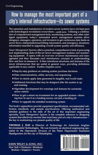How to manage the most important part of a city's internal infrastructure-its sewer systems The operation and maintenance of modern sewer systems have not kept pace with technological revolutions everywhere-until now. Utilizing a combination of computerized management tools, monitoring systems, and other intelligent equipment, today's automated sewer management systems allow designers, managers, operators, and investors to get continuous data feeds on sewer flows, interjurisdictional billing information, and emergency situations: information essential to upgrading overall system quality and efficiency. Sewer Management Systems offers a practical, comprehensive look at procuring and implementing state-of-the-art sewer management systems and monitoring equipment. It opens with an overview of sewer maintenance and management and then discusses such introductory concepts as understanding flow and how to measure it. It then introduces structures and features of the sewer infrastructure that are useful in general ways, providing definitions applicable in any context. Further chapters cover: * Step-by-step guidance on making system purchase decisions * Data communications, utility services, and sequencing * How to clearly apply data generated to tangible, real-world tasks * Additional functions that may be designed after the system is up and running * Algorithm development for warnings and features for automatic sewer control * How to get a return on investment for an upgraded system-showing how to use it as a funding source, not just a funding pit * How to upgrade the installed monitoring system The book's appendices provide equipment specifications, recommended calibration standards, and sample specifications. Offering methodical and detailed guidance to the state of the art of this important engineering specialty, Sewer Management Systems is the complete reference to designing systems that effectively monitor that most basic part of a city's infrastructure-the key to maintaining the city's sewer management systems and monitoring equipment.