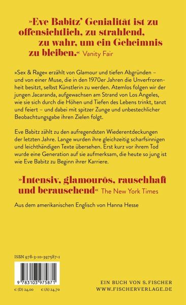 Eve Babitz zählt zu den aufregendsten Wiederentdeckungen der letzten Zeit. Lange wurden ihre gleichzeitig scharfsinnigen und leichthändigen Texte übersehen. Erst kurz vor ihrem Tod wurde eine Generation auf sie aufmerksam, die heute so jung ist, wie Eve Babitz zu Beginn ihrer Karriere. In Sex & Rage erzählt sie von Glamour und tiefen Abgründen - und von einer Muse, die in den 1970er Jahren die Unverfrorenheit besitzt, selbst Künstlerin zu werden. Atemlos folgen wir der jungen Jacaranda, aufgewachsen am Strand von Los Angeles, wie sie sich durch die Höhen und Tiefen des Lebens trinkt, tanzt und feiert - und dabei mit spitzer Zunge und unbestechlicher Beobachtungsgabe ihren Zielen folgt.