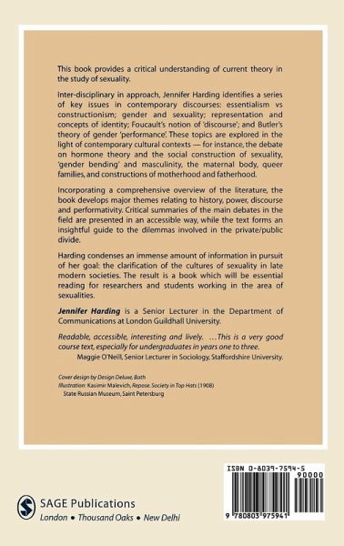 Drawing on original empirical research, this book provides a critical understanding of current theory in the study of sexuality. Inter-disciplinary in approach, Jennifer Harding identifies a series of key issues on contemporary discourses: essentialism vs constructionism; gender and sexuality; representation and concepts of identity; Foucalut¿s notion of `discourse¿; and Butler¿s theory of gender `performance¿. These topics are explored in the light of contemporary cultural contexts - for instance, the debate on hormone theory and the social construction of sexuality, `gender bending¿ and masculinity, the maternal body, queer families, and constructions of motherhood and fatherhood. Critical summaries of the main debates in the field are presented in an accessible way, while the text forms an insightful guide to the dilemmas involved in the private/public divide.