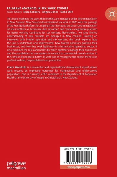 This book examines the ways that brothels are managed under decriminalisation in New Zealand. New Zealand decriminalised sex work in 2003 with the passage of the Prostitution Reform Act, making it the first country to do so. Decriminalisation situates brothels as 'businesses like any other' and creates a legislative platform for better working conditions for sex workers. Nevertheless, we have limited understanding of how brothels are managed in New Zealand. Drawing on interviews with brothel operators and sex workers, this book explores how the law is understood and implemented, how brothel operators position their businesses, and how they seek legitimacy in a historically stigmatised sector. It also examines the rules and norms by which operators manage their businesses and the possibilities for sex workers to consent to commercial sexual services in the context of neoliberal norms of work and of managers who expect them to be professionalised, responsibilised and productive.
