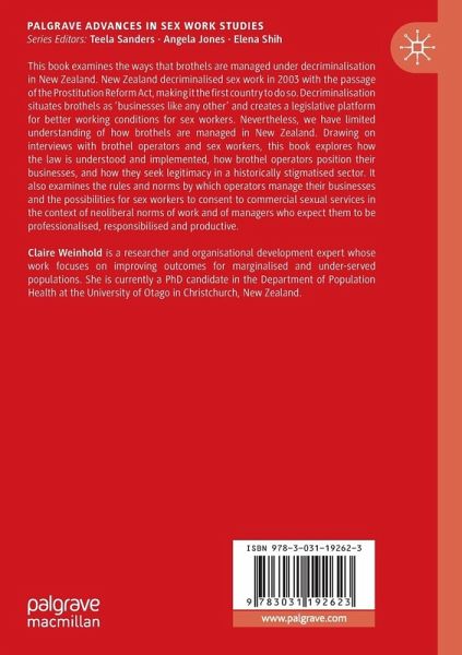This book examines the ways that brothels are managed under decriminalisation in New Zealand. New Zealand decriminalised sex work in 2003 with the passage of the Prostitution Reform Act, making it the first country to do so. Decriminalisation situates brothels as 'businesses like any other' and creates a legislative platform for better working conditions for sex workers. Nevertheless, we have limited understanding of how brothels are managed in New Zealand. Drawing on interviews with brothel operators and sex workers, this book explores how the law is understood and implemented, how brothel operators position their businesses, and how they seek legitimacy in a historically stigmatised sector. It also examines the rules and norms by which operators manage their businesses and the possibilities for sex workers to consent to commercial sexual services in the context of neoliberal norms of work and of managers who expect them to be professionalised, responsibilised and productive.