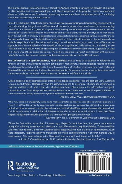 Sex Differences in Cognitive Abilities, Fourth Edition, can be used as a textbook or reference in a range of courses and will inspire the next generation of researchers. Halpern engages readers in the big societal questions that are inherent in the controversial topic of whether, when , and how much males and females differ psychologically. It should be required reading for parents, teachers, and policy makers who want to know about the ways in which males and females are different and similar.