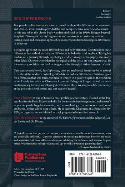 Few people realize how much science can tell us about the differences between men and women. Yves Christen, provided the first comprehensive overview of research in this area when this classic book was first published in the1990s. He goes beyond simplistic "biology is destiny" arguments and constructs a convincing case for linking social and biological approaches in order to understand complex differences in behaviour. Biologists agree that the sexes differ in brain and body structure. Christen links these differences in cerebral anatomy to differences in behaviour and intellect. Taking his readers on a journey through psychology, endocrinology, demography, and many other fields, Christen shows that the biological and the social are not antagonistic. To the contrary, social factors tend to exaggerate the biological rather than neutralize it. This controversial work, Sex Differences, takes on traditional feminism for its refusal to confront the evidence on biologically determined sex differences. Christen argues for a feminism that sees traits common to women in a positive light, in the tradition of such early feminists as Clemence Royer and Margaret Sanger, as well as more contemporary feminist sociobiologists like Sarah Hardy. We deny sex differences only at the price of scientific truth and our own self-respect.