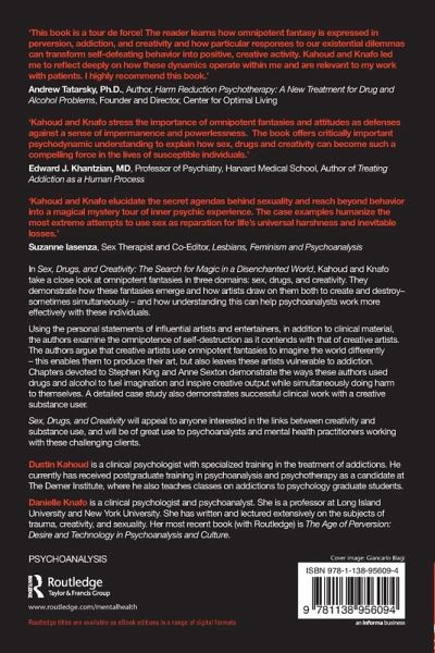 In Sex, Drugs, and Creativity: The Search for Magic in a Disenchanted World, Kahoud and Knafo take a close look at omnipotent fantasies in three domains: sex, drugs, and creativity. They demonstrate how these fantasies emerge and how artists draw on them both to create and destroy-sometimes simultaneously - and how understanding this can help psychoanalysts work more effectively with these individuals. Using the personal statements of influential artists and entertainers, in addition to clinical material, the authors¿examine the omnipotence of self-destruction as it contends with that of creative artists. The authors argue that creative artists use omnipotent fantasies to imagine the world differently - this enables them to produce their art, but also leaves these artists vulnerable to addiction. Chapters devoted to Stephen King and Anne Sexton demonstrate the ways these authors used drugs and alcohol to fuel imagination and inspire creative output while simultaneously doing harm to themselves. A detailed case study also demonstrates successful clinical work with a creative substance user. Sex, Drugs, and Creativity will appeal to anyone interested in the links between creativity and substance use, and will be of great use to psychoanalysts and mental health practitioners working with these challenging clients.