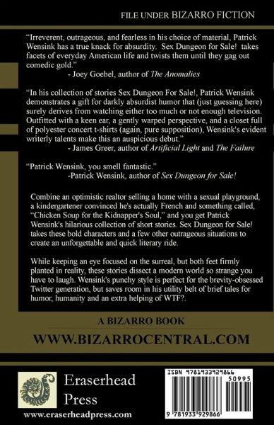 Combine an optimistic realtor selling a home with a sexual playground, a kindergartener convinced he's actually French and something called, "Chicken Soup for the Kidnapper's Soul," and you get Patrick Wensink's hilarious collection of short stories. Sex Dungeon for Sale! Takes these bold characters and a few other outrageous situations to create an unforgettable and quick literary ride. While keeping an eye focused on the surreal, but both feet firmly planted in reality, these stories dissect a modern world so strange you have to laugh. Wensink's punchy style is perfect for the brevity-obsessed Twitter generation, but saves room in his utility belt of brief tales for humor, humanity and an extra helping of WTF?. "Irreverent, outrageous, and fearless in his choice of material, Patrick Wensink has a true knack for absurdity. Sex Dungeon for Sale! takes facets of everyday American life and twists them until they gag out comedic gold."-Joey Goebel, author of Torture the Artist and The Anomalies "In his collection of stories Sex Dungeon For Sale!, Patrick Wensink demonstrates a gift for darkly absurdist humor that (just guessing here) surely derives from watching either too much or not enough television. Outfitted with a keen ear, a gently warped perspective, and a closet full of polyester concert t-shirts (again, pure supposition), Wensink's evident writerly talents make this an auspicious debut."-James Greer, author of Artificial Light and The Failure "Patrick Wensink, you smell fantastic." -Patrick Wensink, author of Sex Dungeon for Sale!