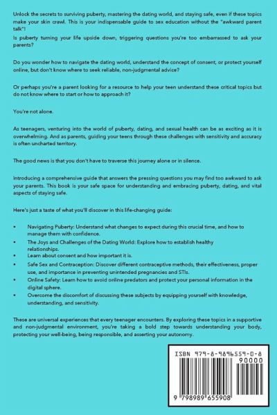 Unlock the secrets to surviving puberty, mastering the dating world, and staying safe, even if these topics make your skin crawl. This is your indispensable guide to sex education without the "awkward parent talk"! Is puberty turning your life upside down, triggering questions you're too embarrassed to ask your parents? Do you wonder how to navigate the dating world, understand the concept of consent, or protect yourself online, but don't know where to seek reliable, non-judgmental advice? Or perhaps you're a parent looking for a resource to help your teen understand these critical topics but do not know where to start or how to approach it? You're not alone. As teenagers, venturing into the world of puberty, dating, and sexual health can be as exciting as it is overwhelming. And as parents, guiding your teens through these challenges with sensitivity and accuracy is often uncharted territory. The good news is that you don't have to traverse this journey alone or in silence. Introducing a comprehensive guide that answers the pressing questions you may find too awkward to ask your parents. This book is your safe space for understanding and embracing puberty, dating, and vital aspects of staying safe. Here's just a taste of what you'll discover in this life-changing guide: * Navigating Puberty: Understand what changes to expect during this crucial time, and how to manage them with confidence. * The Joys and Challenges of the Dating World: Explore how to establish healthy relationships. * Learn about consent and how important it is. * Safe Sex and Contraception: Discover different contraceptive methods, their effectiveness, proper use, and importance in preventing unintended pregnancies and STIs. * Online Safety: Learn how to avoid online predators and protect your personal information in the digital sphere. * Overcome the discomfort of discussing these subjects by equipping yourself with knowledge, understanding, and sensitivity. These are universal experiences that every teenager encounters. By exploring these topics in a supportive and non-judgmental environment, you're taking a bold step towards understanding your body, protecting your well-being, being responsible, and asserting your autonomy.