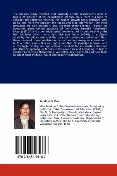 The present study revealed that, majority of the respondents were in favour of inclusion of sex education in schools. Thus, there is a need to consider sex education essential for proper growth for a balanced view point. The more we consider this taboo and hide information, the more mystiques are built around it, and the more alluring it gets. Though sex education alone cannot eradicate all the crimes, Sexually Transmitted Diseases (STDs) and other adolescents problems; but it could be one of the best initiatives which may at least decrease the probability of problems faced by the adolescents…mehr