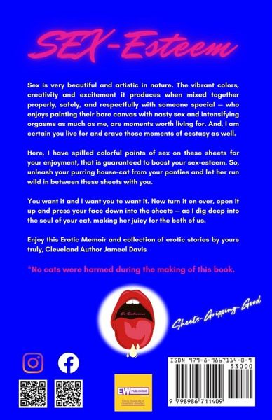 Sex is very beautiful and artistic in nature. The vibrant colors, creativity and excitement it produces when mixed together properly, safely, and respectfully with someone special - who enjoys painting their bare canvas with nasty sex and intensifying orgasms as much as me, are moments worth living for. And, I am certain you live for and crave those moments of ecstasy as well. Here, I have spilled colorful paints of sex on these sheets for your enjoyment, that is guaranteed to boost your sex-esteem. So, unleash your purring house-cat from your panties and let her run wild in between these sheets with you. You want it and I want you to want it. Now turn it on over, open it up and press your face down into the sheets - as I dig deep into the soul of your cat, making her juicy for the both of us. Enjoy this Erotic Memoir and collection of erotic stories by yours truly, Cleveland Author Jameel Davis *No cats were harmed during the making of this book.