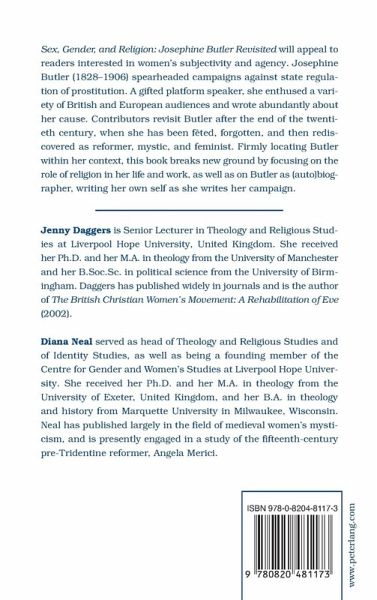Sex, Gender, and Religion: Josephine Butler Revisited will appeal to readers interested in women's subjectivity and agency. Josephine Butler (1828-1906) spearheaded campaigns against state regulation of prostitution. A gifted platform speaker, she enthused a variety of British and European audiences, and wrote abundantly about her cause. Contributors revisit Butler after the end of the twentieth century, where she has been fêted, forgotten, and then rediscovered as reformer, mystic, and feminist. Firmly locating Butler within her context, this book breaks new ground by focusing on the role of religion in her life and work, as well as on Butler as (auto)biographer, writing her own self as she writes her campaign.