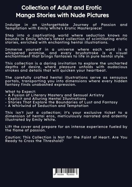 Indulge in an Unforgettable Journey of Passion and Temptation with Emily White's Erotic Masterpiece!Step into a captivating world where seduction knows no bounds in Emily White's latest collection of scintillating erotic stories, enriched with enchanting hentai illustrations. Immerse yourself in a universe where each word is a whispered promise, and every brushstroke is a visual enchantment that brings fantasies to life in pure hentai style.This collection is a daring invitation to explore the uncharted depths of desire, where pleasure unfolds with audacious strokes and details that will quicken your heartbeat. The carefully crafted hentai illustrations serve as sensuous portals, transporting you into dimensions where every hidden fantasy finds unabashed expression.What to Expect:- A Fusion of Literary Mastery and Sensual Artistry- Explicit and Alluring Hentai Illustrations- Stories That Explore the Boundaries of Lust and Fantasy- A Whirlwind of Seduction and TemptationThis isn'tjust a collection; it's your exclusive ticket to a dimension of hentai eros, meticulously narrated and ardently illustrated by Emily White. Lift the cover and prepare for an intense experience fueled by the flame of passion.Caution: This Collection is Not for the Faint of Heart. Are You Ready to Cross the Threshold?