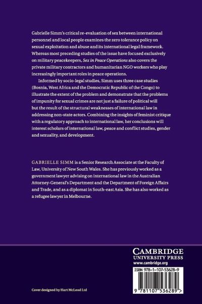 Gabrielle Simm's critical re-evaluation of sex between international personnel and local people examines the zero tolerance policy on sexual exploitation and abuse and its international legal framework. Whereas most preceding studies of the issue have focused exclusively on military peacekeepers, Sex in Peace Operations also covers the private military contractors and humanitarian NGO workers who play increasingly important roles in peace operations. Informed by socio-legal studies, Simm uses three case studies (Bosnia, West Africa and the Democratic Republic of the Congo) to illustrate the extent of the problem and demonstrate that the problems of impunity for sexual crimes are not just a failure of political will but the result of the structural weaknesses of international law in addressing non-state actors. Combining the insights of feminist critique with a regulatory approach to international law, her conclusions will interest scholars of international law, peace and conflict studies, gender and sexuality, and development.