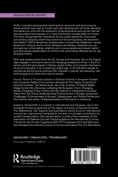 List of Figures and Tables, List of Contributors, List of Abbreviations, Introduction (Paul G Nixon and Isabel Düsterhöft) 1. The Affective and Affectless Bodies of Monster Toon Porn (Susanna Paasonen) 2. Participatory Porn Culture: Feminist Positions and Oppositions in the Internet Pornosphere (Allegra W. Smith) 3. Young People and Sexual Media (Cosimo Marco Scarcelli) 4. Sex Education in the Digital Age (Deb Levine) 5. Love at our Fingertips: Exploring the Design Implications of Mobile Dating Technologies (Jessica L. James) 6. Sexting (Michelle Drouin) 7. "Nude Selfies til I die" - Making of "Sexy" in Selfies (Katrin Tiidenberg) 8. Nothing to Hide: Selfies, Sex and the Visibility Dilemma in Trans Male Online Cultures (Tobias Raun and Cáel M. Keegan) 9. Supporting One Another: Nonbinary Community Building on Tumblr (Abigail Oakley) 10. "Cake is Better Than Sex" - AVEN and Asexuality (Agata Pacho) 11. Gay Men and the Internet: Unlimited Possibility. Lived Reality (David Gudelunas) 12. Two-faced Racism in a Gay Online Sex: Preference in the Frontstage or Racism in the Backstage? (Jesus Gregorio Smith) 13. Representing Bisexuality in the Digital Age (Nora Madison) 14. Exploring Polyamory Online: Ethics, Relationships and Understanding (Abbi Bloedel and Jimmie Manning) 15. Becoming BDSM in an Online Environment (Alan McKee and Rebecca S. Randall) 16. Negotiations of Identity, Pleasure and Health in Women's Online Sex Work Advertisements (Alexandra S. Marcotte and Justin R. Garcia) 17. Gaming and Sex (Ashley ML Brown and Rob Gallagher) 18. Hell Yes!!!!!: Playing Away, Teledildonics and the future of Sex (Paul G Nixon) Index