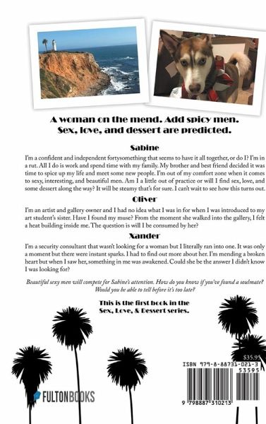 A woman on the mend. Add spicy men. Sex, love, and dessert are predicted. Sabine I'm a confident and independent fortysomething that seems to have it all together, or do I? I'm in a rut. All I do is work and spend time with my family. My brother and best friend decided it was time to spice up my life and meet some new people. I'm out of my comfort zone when it comes to sexy, interesting, and beautiful men. Am I a little out of practice or will I find sex, love, and some dessert along the way? It will be steamy that's for sure. I can't wait to see how this turns out. Oliver I'm an artist and gallery owner and I had no idea what I was in for when I was introduced to my art student's sister. Have I found my muse? From the moment she walked into the gallery, I felt a heat building inside me. The question is will I be consumed by her? Xander I'm a security consultant that wasn't looking for a woman but I literally ran into one. It was only a moment but there were instant sparks. I had to find out more about her. I'm mending a broken heart but when I saw her, something in me was awakened. Could she be the answer I didn't know I was looking for? Beautiful sexy men will compete for Sabine's attention. How do you know if you've found a soulmate? Would you be able to tell before it's too late? This is the first book in the Sex, Love, & Dessert series. Sex, Love, & Dessert is a multi-POV adventure. This novel contains content intended for mature audiences only.