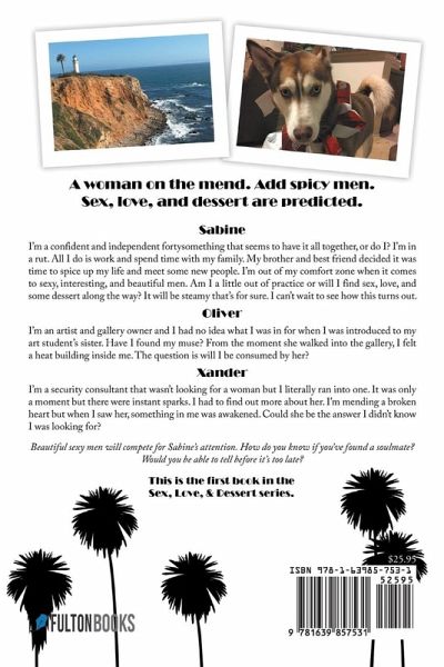 A woman on the mend. Add spicy men. Sex, love, and dessert are predicted. Sabine I'm a confident and independent fortysomething that seems to have it all together, or do I? I'm in a rut. All I do is work and spend time with my family. My brother and best friend decided it was time to spice up my life and meet some new people. I'm out of my comfort zone when it comes to sexy, interesting, and beautiful men. Am I a little out of practice or will I find sex, love, and some dessert along the way? It will be steamy that's for sure. I can't wait to see how this turns out. Oliver I'm an artist and gallery owner and I had no idea what I was in for when I was introduced to my art student's sister. Have I found my muse? From the moment she walked into the gallery, I felt a heat building inside me. The question is will I be consumed by her? Xander I'm a security consultant that wasn't looking for a woman but I literally ran into one. It was only a moment but there were instant sparks. I had to find out more about her. I'm mending a broken heart but when I saw her, something in me was awakened. Could she be the answer I didn't know I was looking for? Beautiful sexy men will compete for Sabine's attention. How do you know if you've found a soulmate? Would you be able to tell before it's too late? This is the first book in the Sex, Love, & Dessert series. Sex, Love, & Dessert is a multi-POV adventure. This novel contains content intended for mature audiences only.