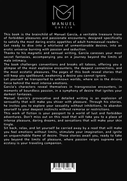 This book is the brainchild of Manuel García, a veritable treasure trove of forbidden pleasures and passionate encounters, designed specifically to satisfy the most daring erotic appetites of adult homosexual readers.Get ready to dive into a whirlwind of unmentionable desires, into an erotic universe burning with passion and seduction. Thanks to his magnetic and sensual writing, García caresses your most secret fantasies, accompanying you on a journey beyond the limits of male intimacy.The book challenges conventions and breaks all taboos, offering a glimpse of the most explosive encounters, the deepest bonds, and the most ecstatic pleasures. The pages of this book reveal stories that will keep you spellbound, awakening a desire you cannot ignore.Let yourself be transported to unknown worlds, where sin is the driving force behind the most intense emotions. García's characters reveal themselves in transgressive encounters, in moments of boundless passion, in a symphony of desire that ignites your darkest fantasies.Manuel García's provocative and detailed writing is an explosion of sensuality that will make you shiver with pleasure. Through his stories, he invites you to explore your sexuality without inhibitions, to abandon yourself to your deepest instincts without remorse or restrictions.This work of fiction is your passport to a world of lust and forbidden adventures. Don't miss out on this read that will take you to a place of intense pleasure, daring dreams, and sensations that will make your skin tingle.Sit back, relax, and let yourself be carried away by a read that will make you feel emotions without limits, stimulate your imagination, and ignite an unquenchable flame of desire. These stories await you, ready to take you beyond the limits of pleasure, where passion reigns supreme and ecstasy is your traveling companion.