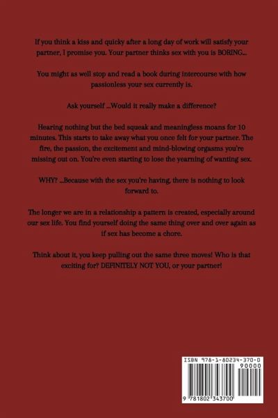 If you think a kiss and quicky after a long day of work will satisfy your partner, I promise you. Your partner thinks sex with you is BORING... You might as well stop and read a book during intercourse with how passionless your sex currently is. Ask yourself ...Would it really make a difference? Hearing nothing but the bed squeak and meaningless moans for 10 minutes. This starts to take away what you once felt for your partner. The fire, the passion, the excitement and mind-blowing orgasms you're missing out on. You're even starting to lose the yearning of wanting sex. WHY? ...Because with the sex you're having, there is nothing to look forward to. The longer we are in a relationship a pattern is created, especially around our sex life. You find yourself doing the same thing over and over again as if sex has become a chore. Think about it, you keep pulling out the same three moves! Who is that exciting for? DEFINITELY NOT YOU, or your partner! According to "The Washington Post", experts who study Americans' bedroom habits found that there are a number of factors driving "The Great American Sex Drought." Changing it up and using NEW found researched sex techniques that focus primarily on couples simulation, will finally give you and your partner the sex you always yarned for, and stop any kind of sex drought. Imagine having sex that makes you feel like you're in the honeymoon stage all the time. Learning these techniques, you won't be able to keep your hands off each other. Always in the mood for intense orgasmic sex filled with passion and deep connection, you make your partner fall in love with you over and over again. In "Sex Positions For Couples", you'll discover: A Step-by-Step guide on how to have mind-blowing orgasms and learn how to give them How to boost your sexual confidence and lovemaking skills in a short amount of time... Find out 8 important steps to build the deepest connection with your partner you ever had Realistic how to's of sex positions that empower you How to overcome not knowing what to do in the bedroom The right mindset to avoid emotional stress and overcome your fears of being embarrassed in front of your partner How to get unstuck from a "SEXUAL ROUTINE" you have developed over the years A share of U.S. adults reporting no sex in the past year between couples is skyrocketing. Don't make the same old mistakes by staying safe and becoming unattached. This is NOT okay! Stepping up and trying something new in the bed can be terrifying, scary, embarrassing, and uncomfortable. Save yourself from years of wasted GOOD sex. Start reading now to make your partner look at you with REAL admiration!