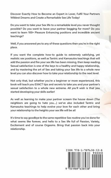 Discover Exactly How to Become an Expert in Lover, Fulfil Your Partners Wildest Dreams and Create a Remarkable Sex Life Today! Do you want to take your Sex life to a remarkable level you never thought possible? Do you want to leave your partner begging for more? Do you want to learn 100+ Pleasure Enhancing positions and incredible ancient teachings? Well, if you answered yes to any of these questions then you're in the right place. If you want the complete how to guide to extremely satisfying, yet realistic sex positions, as well as Tantric and Kamasutra teachings that will add the passion and fire your sex life has been missing, then keep reading. Sexual satisfaction is one of the keys to a healthy and happy relationship, and by mastering the art of Sex and taking your Sex life to a whole new level you can also discover how to take your relationship to the next level. As well as learning to make your partner scream the house down (The neighbours are going to hate you....) we've also included Tantric and Kamasutra teachings to help evolve your love for each other and bring your relationship to the heights your sex life will be at! It's time to say goodbye to the same repetitive Sex routine you've done for what seems like forever, and hello to a Sex life full of Passion, Variety, Excitement and of course Orgasms. Bring that passion back into your relationship. Here's a slither of what you'll discover... A step by step guide to MASTERING the art of Sex and taking your love life to a whole new dimension... 100+ Climax Enhancing Sex and Oral Sex Positions (For the men out there there's more than just 1 type of Orgasm Women can have!) An Easy to Follow 'How To' Guide to EVERY Position in the Book to Make Sure You Know EXACTLY How To do it! The Ancient Teachings of the Kamasutra and how they can Revolutionize Your Sex Life (Starting TONIGHT!) What Lesbians Know About Sex, That 90% of Men Have No Idea About! The Remarkable Power of Tantric Teachings and Why They Can Rejuvenate The Passion Back Into Your Relationship (Including Tantric Sex Positions of Course!) MUST KNOW Tips to Maximise The Pleasure From EVERY Position In The Book 4 Must Know Things to Master the Art of Foreplay and Lead Up To Sex 43+ G-Spot Stimulating Sex Positions History, Benefits and Philosophy of the Kamasutra 11 Startling Tips to Take Your Sex Life to a Level You Never Believed Possible And that is barely even scratching the surface! Even if you've only ever done the 3 basic positions in your life, and even if your sex life has become drier than the Saharan Desert this Book outlines exactly how You can master the art of Sex, get the passion back into the bedroom and reach new levels of pleasure you didn't even know existed. It's time you left your partner wondering in disbelief (After you both have screamed the house down) asking 'What just happened there!' after you introduce them to your new found Sexual prowess. So, if you're ready to fulfil your partners wildest dreams (and of course your own) then scroll up and click "Add to Cart."