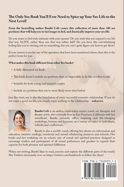 The Only Sex Book You'll Ever Need to Spice up Your Sex Life to the Next Level! From the bestselling author Bambi Colt comes this collection of more than 100 sex positions that will help you to last longer in bed, and drastically improve your sex life. Do you feel that your sex life has become monotonous? Do you wish that you enjoyed a sex life that was ALIVE, rather than one that was rather dull? Do you have this overwhelming feeling like you're missing out on something, but you can't quite figure out how to get there? If your answer is yes for any of the questions that have been mentioned above, then this is the perfect book for you. What makes this book different from other Sex books? A fully illustrated sex book This book doesn't include sex positions that are impossible to do like in other books Suitable for both young and married couples Include sex positions that you've most likely never tried before IT’S NEVER TOO LATE TO GET THE SEX LIFE YOU ALWAYS WANTED! Knowing how you and your loved one can find immense pleasure by exploring one another’s desires Sexy scenarios and hot new moves to ramp up your sex life! The best sexual positions to make you climax Confidence boosters that make you feel sexier than ever and bring out your inner thrill-seeker Fixes for common bedroom problems such as low desire, mismatched libidos, and sexual boredom The most amazing sex of your life—at any age, even after kids! Just like trust, sex is also the foundation of every successful romantic relationship. If you do not enjoy a good sex life, you simply enjoy nothing in the relationship. - unknown Would You Like to Know More? Scroll to the top of the page and add this amazing sex book to your cart and Get your copy Today! See you inside!