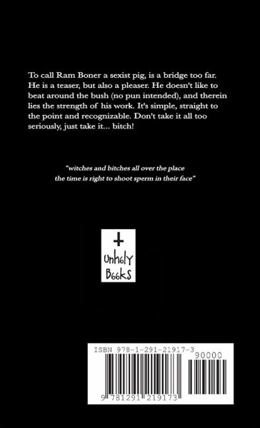 To call Ram Boner a sexist pig, is a bridge too far. He is a teaser, but also a pleaser. He doesn't like to beat around the bush (no pun intended), and therein lies the strength of his work. It's simple, straight to the point and recognizable. Don't take it all too seriously, just take it... bitch! "witches and bitches all over the place the time is right to shoot sperm in their face"