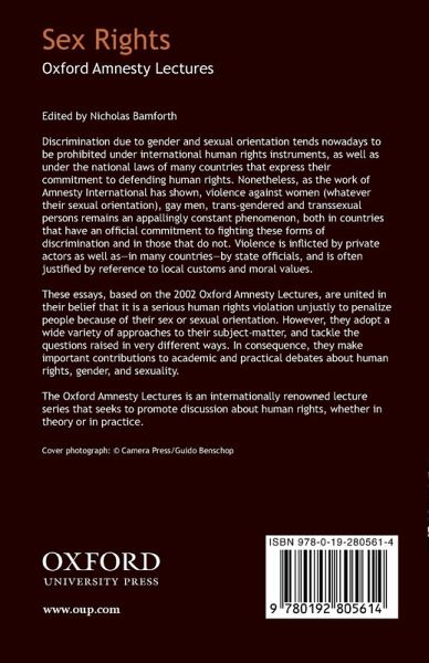 Discrimination due to gender and sexual orientation tends nowadays to be prohibited under international human rights instruments, as well as under the national laws of many countries that express their commitment to defending human rights. Nonetheless, as the work of Amnesty International has shown, violence against women (whatever their sexual orientation), gay men, trans-gendered and transsexual persons remains an appallingly constant phenomenon, both in countries that have an official commitment to fighting these forms of discrimination and in those that do not. These essays seek to explore some of the inter-connections between human rights, gender, and sexuality. The contributors are united in their belief that it is a serious human rights violation unjustly to penalize people because of their sex or sexual orientation. Many difficult questions are considered. How do we understand and categorize human rights abuses related to a person's sex or sexual orientation, for example? Does their inclusion within the remit of human rights abuses require us to refine what we mean by human rights? What weight, if any, should be given to demands made in the name of particular religious and cultural traditions which seek to restrict the rights of women and sexual minority groups? And how far have we come, and how far have we left to go, in the quest for a world in which discrimination based on sex and sexual orientation is a thing of the past?