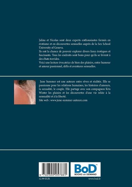 Jalina et Nicolas sont deux experts enthousiastes formés en érotisme et en découvertes sensuelles auprès de la Sex School University of Geneva.Ils ont la chance de pouvoir explorer divers lieux érotiques et fascinants. Tous les endroits sont bons pour qu'ils se livrent à des ébats torrides. De soirées échangistes en pratiques sado-maso, ils perfectionnent continuellement la formation dispensée par la Sex School.De plus, ils ont le privilège de vivre un attachement amoureux qui multiplie d'autant plus la jouissance qu'ils éprouvent dans leurs jeux érotiques. Une lecture évocatrice de bien des plaisirs, entre humour et amour passionnel, défis et aventures sensuelles.Ce livre fait partie de la série DEUX PLUMES POUR DEUX AMANTS, ainsi que Rencontres Clandestines et ZigZag Café. Ces trois livres vous sont contés par par un duo d'amants-complices,pour plus de plaisir...