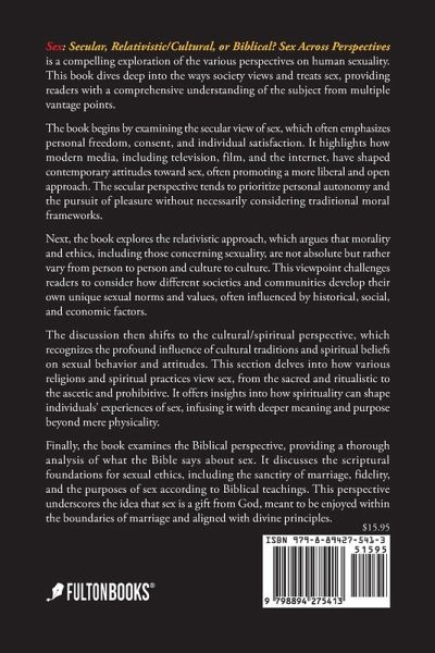 Sex: Secular, Relativistic/Cultural, or Biblical? Sex Across Perspectives is a compelling exploration of the various perspectives on human sexuality. This book dives deep into the ways society views and treats sex, providing readers with a comprehensive understanding of the subject from multiple vantage points. The book begins by examining the secular view of sex, which often emphasizes personal freedom, consent, and individual satisfaction. It highlights how modern media, including television, film, and the internet, have shaped contemporary attitudes toward sex, often promoting a more liberal and open approach. The secular perspective tends to prioritize personal autonomy and the pursuit of pleasure without necessarily considering traditional moral frameworks. Next, the book explores the relativistic approach, which argues that morality and ethics, including those concerning sexuality, are not absolute but rather vary from person to person and culture to culture. This viewpoint challenges readers to consider how different societies and communities develop their own unique sexual norms and values, often influenced by historical, social, and economic factors. The discussion then shifts to the cultural/spiritual perspective, which recognizes the profound influence of cultural traditions and spiritual beliefs on sexual behavior and attitudes. This section delves into how various religions and spiritual practices view sex, from the sacred and ritualistic to the ascetic and prohibitive. It offers insights into how spirituality can shape individuals' experiences of sex, infusing it with deeper meaning and purpose beyond mere physicality. Finally, the book examines the Biblical perspective, providing a thorough analysis of what the Bible says about sex. It discusses the scriptural foundations for sexual ethics, including the sanctity of marriage, fidelity, and the purposes of sex according to Biblical teachings. This perspective underscores the idea that sex is a gift from God, meant to be enjoyed within the boundaries of marriage and aligned with divine principles.