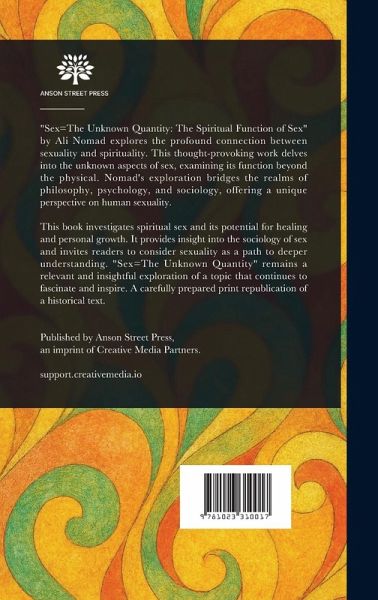 "Sex=The Unknown Quantity: The Spiritual Function of Sex" by Ali Nomad explores the profound connection between sexuality and spirituality. This thought-provoking work delves into the unknown aspects of sex, examining its function beyond the physical. Nomad's exploration bridges the realms of philosophy, psychology, and sociology, offering a unique perspective on human sexuality. This book investigates spiritual sex and its potential for healing and personal growth. It provides insight into the sociology of sex and invites readers to consider sexuality as a path to deeper understanding. "Sex=The Unknown Quantity" remains a relevant and insightful exploration of a topic that continues to fascinate and inspire. A carefully prepared print republication of a historical text. This work has been selected by scholars as being culturally important, and is part of the knowledge base of civilization as we know it. This work is in the public domain in the United States of America, and possibly other nations. Within the United States, you may freely copy and distribute this work, as no entity (individual or corporate) has a copyright on the body of the work. Scholars believe, and we concur, that this work is important enough to be preserved, reproduced, and made generally available to the public. We appreciate your support of the preservation process, and thank you for being an important part of keeping this knowledge alive and relevant.
