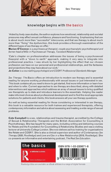 'Sex Therapy: The Basics is a courageous attempt to wrestle sex and relationship matters away from the specialist professionals - a decided minority - and to restore them to the vast group of health professionals dealing with them on a day-to-day basis. Her publication treads a fine line between accessibility and the necessary nuances required by this important field. The inclusion of professional issues as well as diversity themes is particularly laudable. As course director of a national training organisation focusing on sex and relationships, I welcome this pioneering work and consider it essential reading.'
